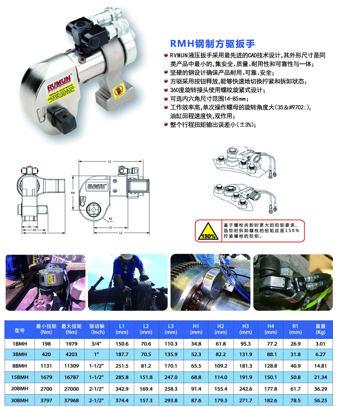 ★若需要更大扭矩的液壓扳手或定制滿足不同工況的特殊液壓扳手請與RVMUN銷售工程師或就近分銷商聯(lián)系